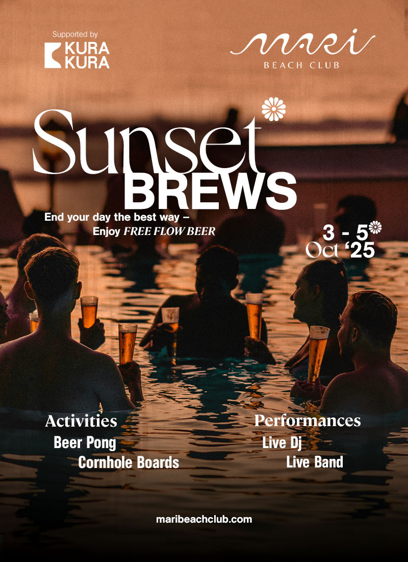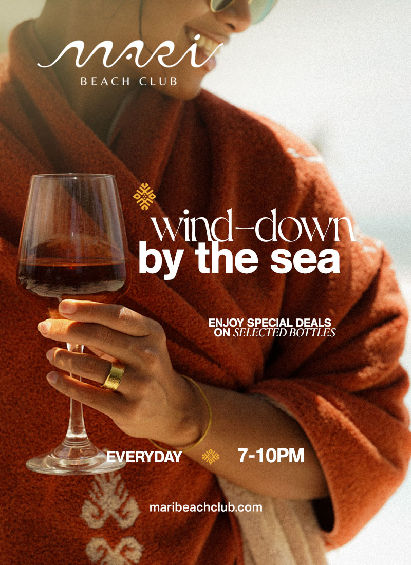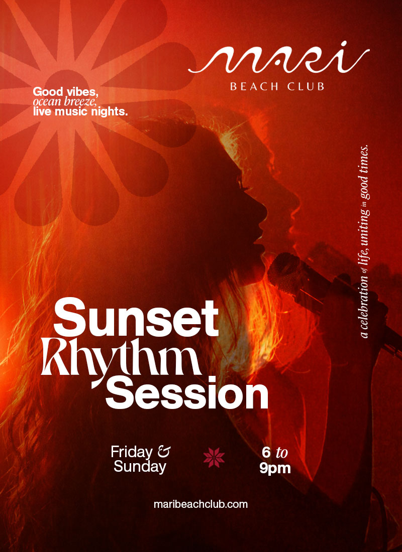 Located on the sun drenched deck of Mari Beach Club, deeply connected to the organic landscape of Mari with prime views of the ocean and sunset designed to enhance your feeling of nature.